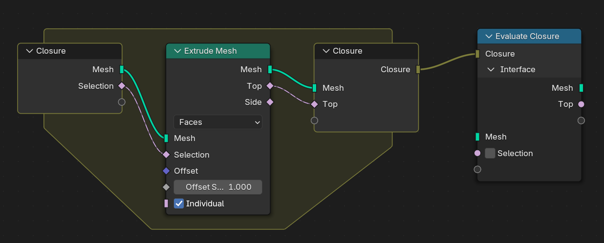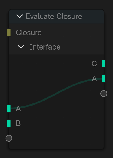 When an Evaluate Closure node is muted or no closure is connected to it, it automatically passes through values for inputs and outputs with the same name. This is very useful when the closure just is optional for the user.