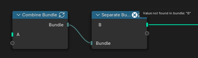 As hinted at before, both closures and bundles use names to identify their inputs and outputs. If the names don’t match, there is an error. Generally, it is not possible to automatically rename the sockets because the corresponding nodes may be in entirely separate node groups.