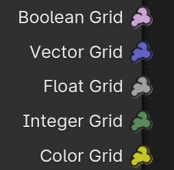 At the core of this update is the new volume grid data type, corresponding to volumetric data with a specific data-type, be it floats, vectors, or another primitive type. Nodes that work on grids explicitly use the new grid socket shape. The color of the socket indicates what kind of grid it is. A common use-case is to use a float grid to store density values.