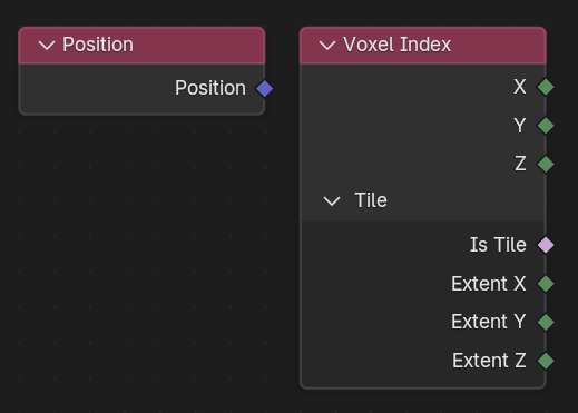 There are two main field input nodes that can be used when creating a field that is evaluated in the context of a voxel: the standard Position node, and the new Voxel Index node.