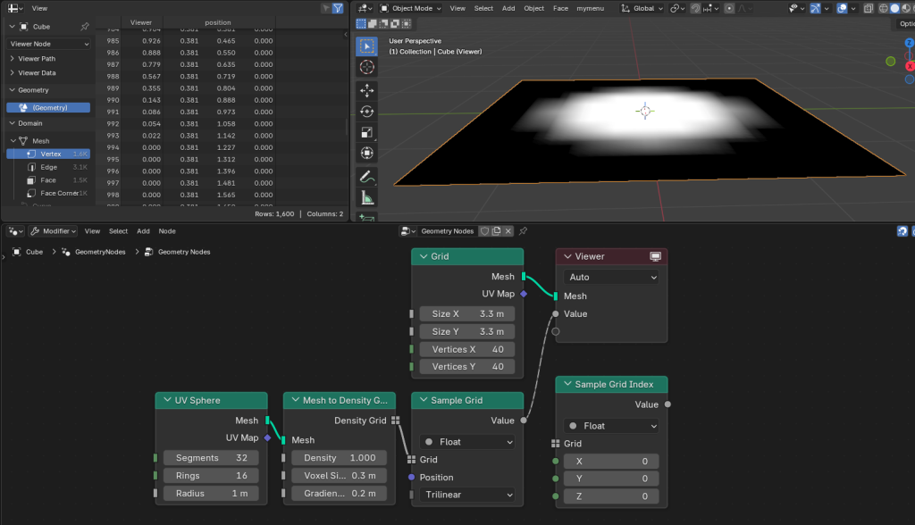 Additionally, each volume grid has a transform (location, rotation and scale) which maps the index-space to object-space. For example, if the grid has a scale of 0.1, each voxel is 0.1 units large in each direction and the voxel (5, 0, 0) corresponds to the object space position (0.5, 0, 0). The grid transform can be set with the Set Grid Transform node and can be retrieved with the Grid Info node.