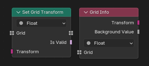 Additionally, each volume grid has a transform (location, rotation and scale) which maps the index-space to object-space. For example, if the grid has a scale of 0.1, each voxel is 0.1 units large in each direction and the voxel (5, 0, 0) corresponds to the object space position (0.5, 0, 0). The grid transform can be set with the Set Grid Transform node and can be retrieved with the Grid Info node.
